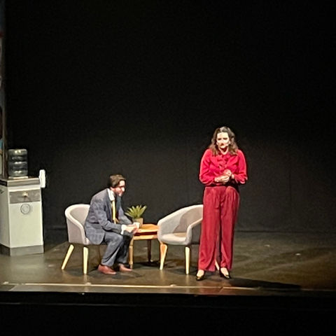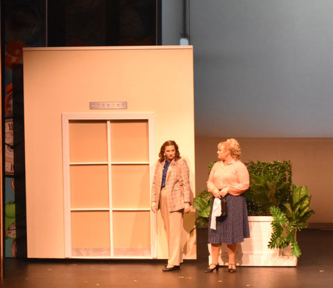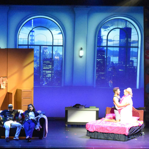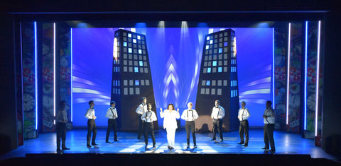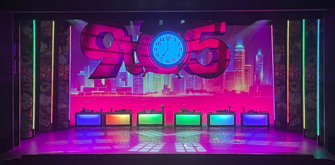 Reversible wall for office bullpen and Hart's Office, wing coverings with clock design, large 9to5 sign with projection space, desks with LED lights, desk chairs, moveable planter, water cooler, office kitchen, toilet block, elevator, couch, queen bed with 3 variations of headboard for different rooms, hospital bed, waiting room chairs, digital backgrounds for each scene and more.